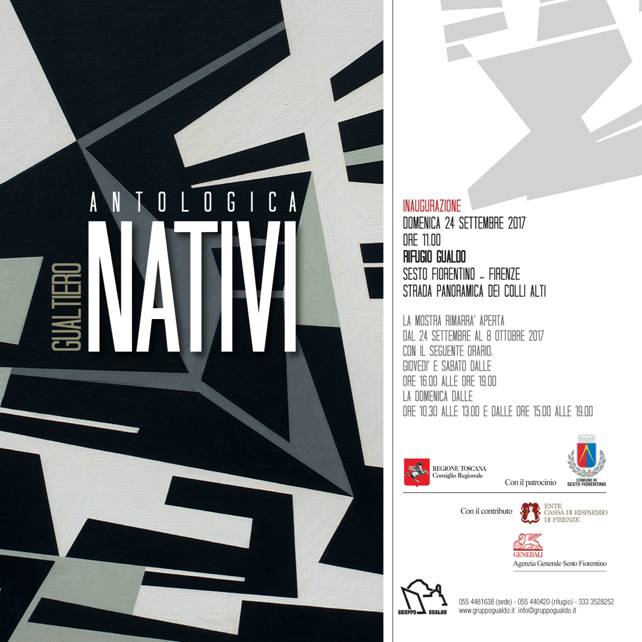 Progetto d'allestimento e coordinato grafico per la mostra antologica di Gualtiero Nativi, Rifugio Gualdo (Sesto F.no), Settembre 2017
